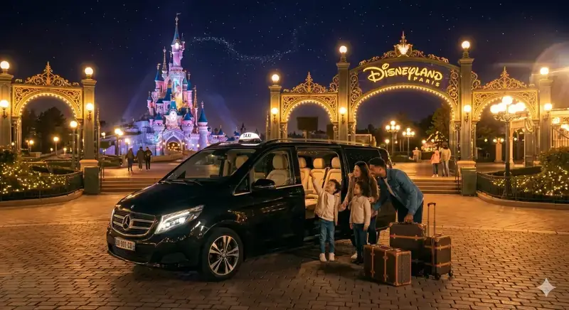 Votre taxi agréé préfecture pour tous vos transferts Disneyland Paris : aéroports CDG, Orly, Beauvais, gares parisiennes, hôtels Disney et partenaires, Val d'Europe. Mercedes Classe V 7 places, sièges enfants offerts, chauffeur francophone et anglophone. Basé à 5 minutes des parcs à Serris.